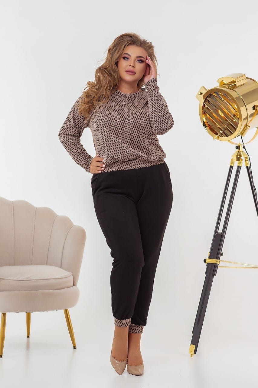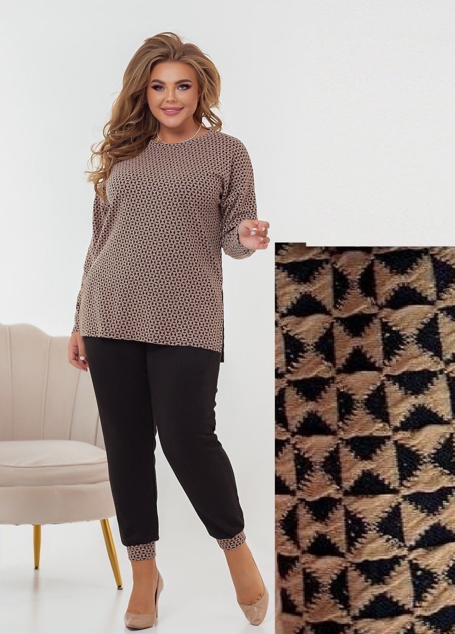Материал: кофточка - трикотажный жаккард (мягкий , плотный, слегка стрейчевый, приятный на ощупь). По бокам - разрезы. Длина 70 см. Брюки- замша на дайвинге (плотная стрейчевая ткань), пояс на резинке. Длина 95-100 по внешнему шву, 71 см по внутреннему шву. Замеры по изделию: