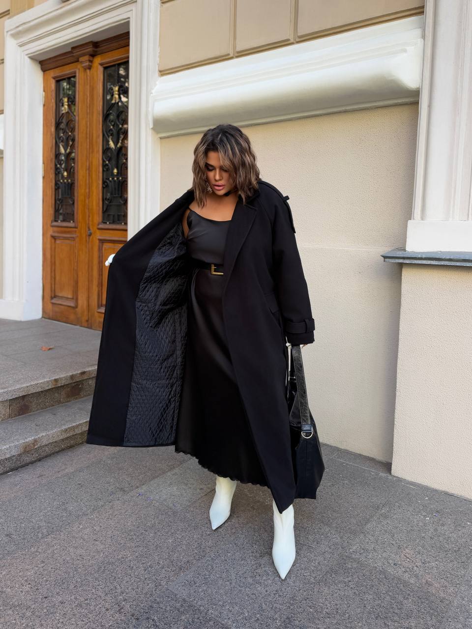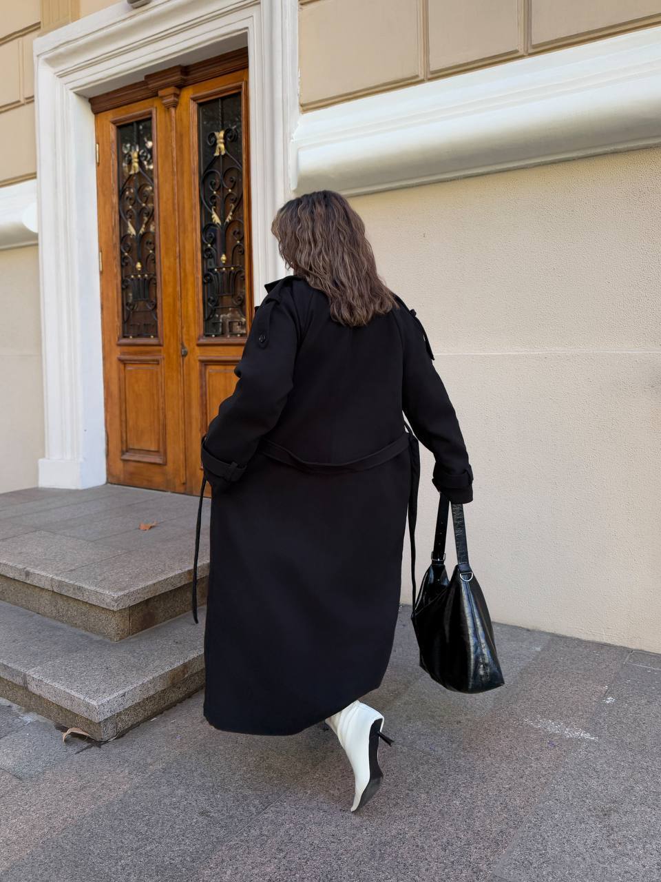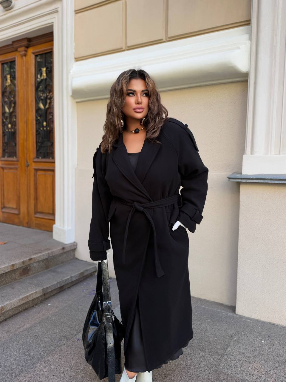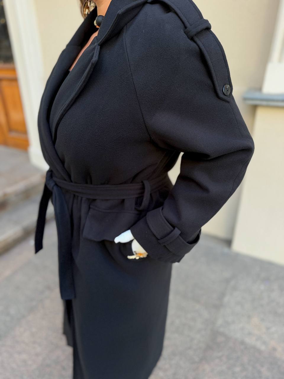 Матеріал:кашемир .Не кошлатиться. Утеплена підкладка на синтепоні 80 щильності. Дві бокові кишені. Одягається на запах, завʼязується поясом. Декоровано хлястиками на рукавах та плечах.