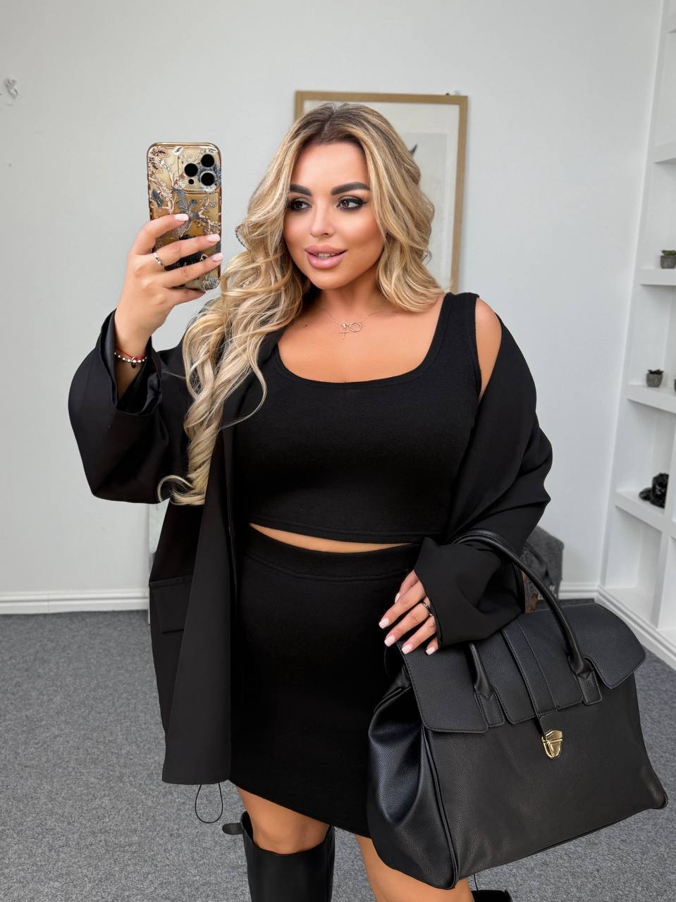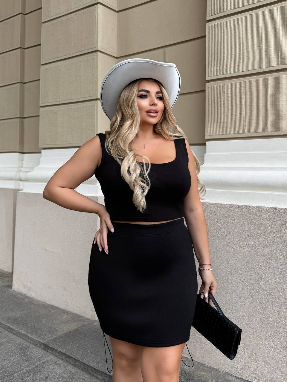 В’язана тканина Дабл Ангора . Дуже гарна розтяжність. В спідниці По бокам є мотузочки, якими можна регулювати довжину. Довжина топа в 42-46 р — 47 см, в інших— 54 см